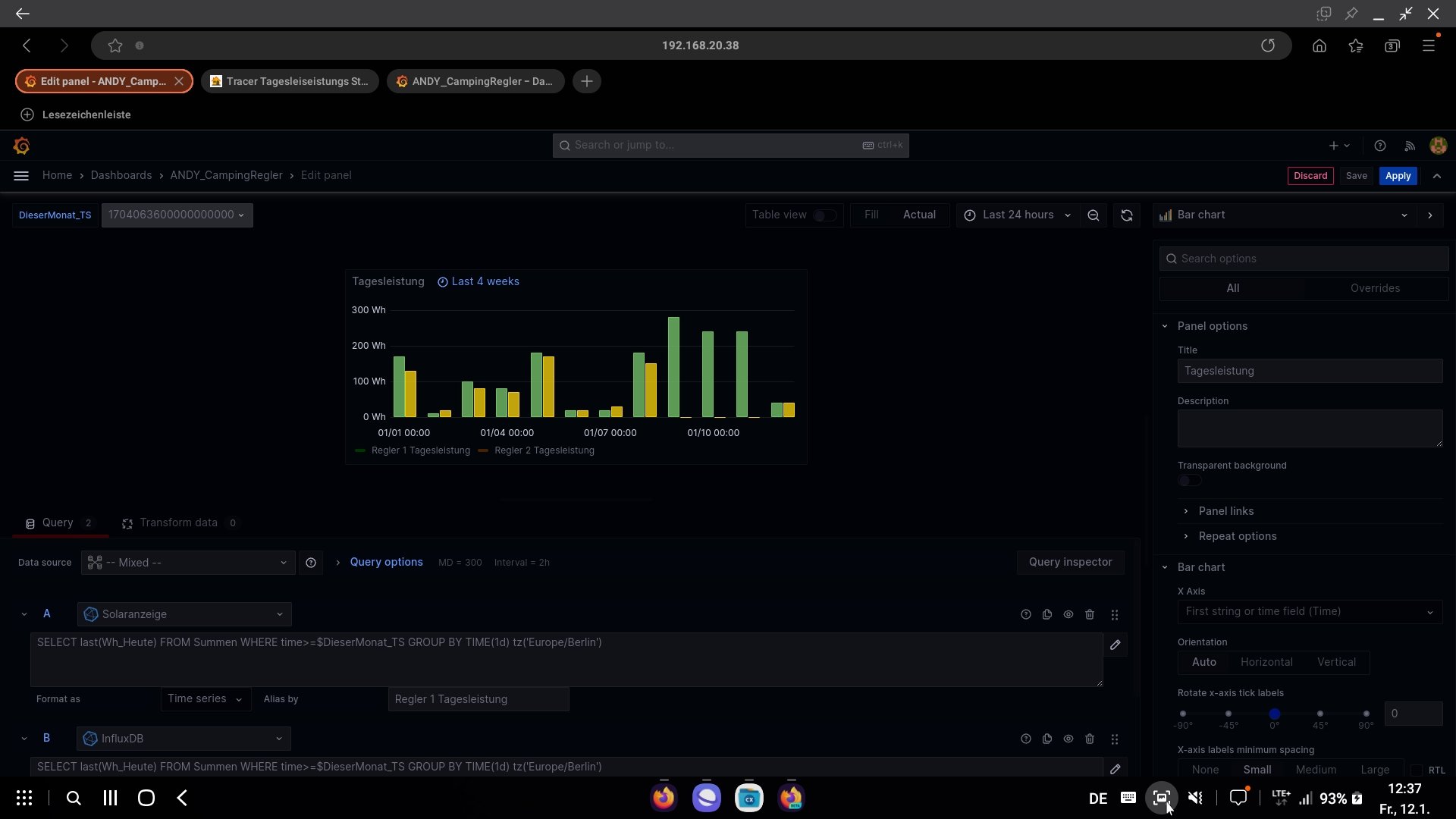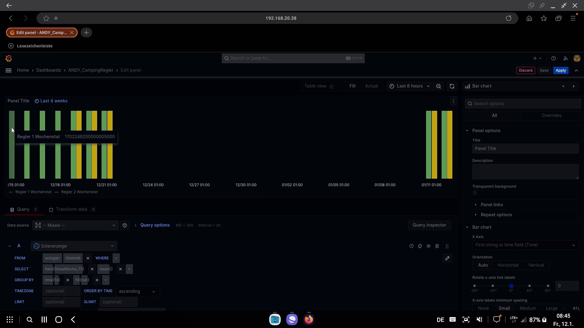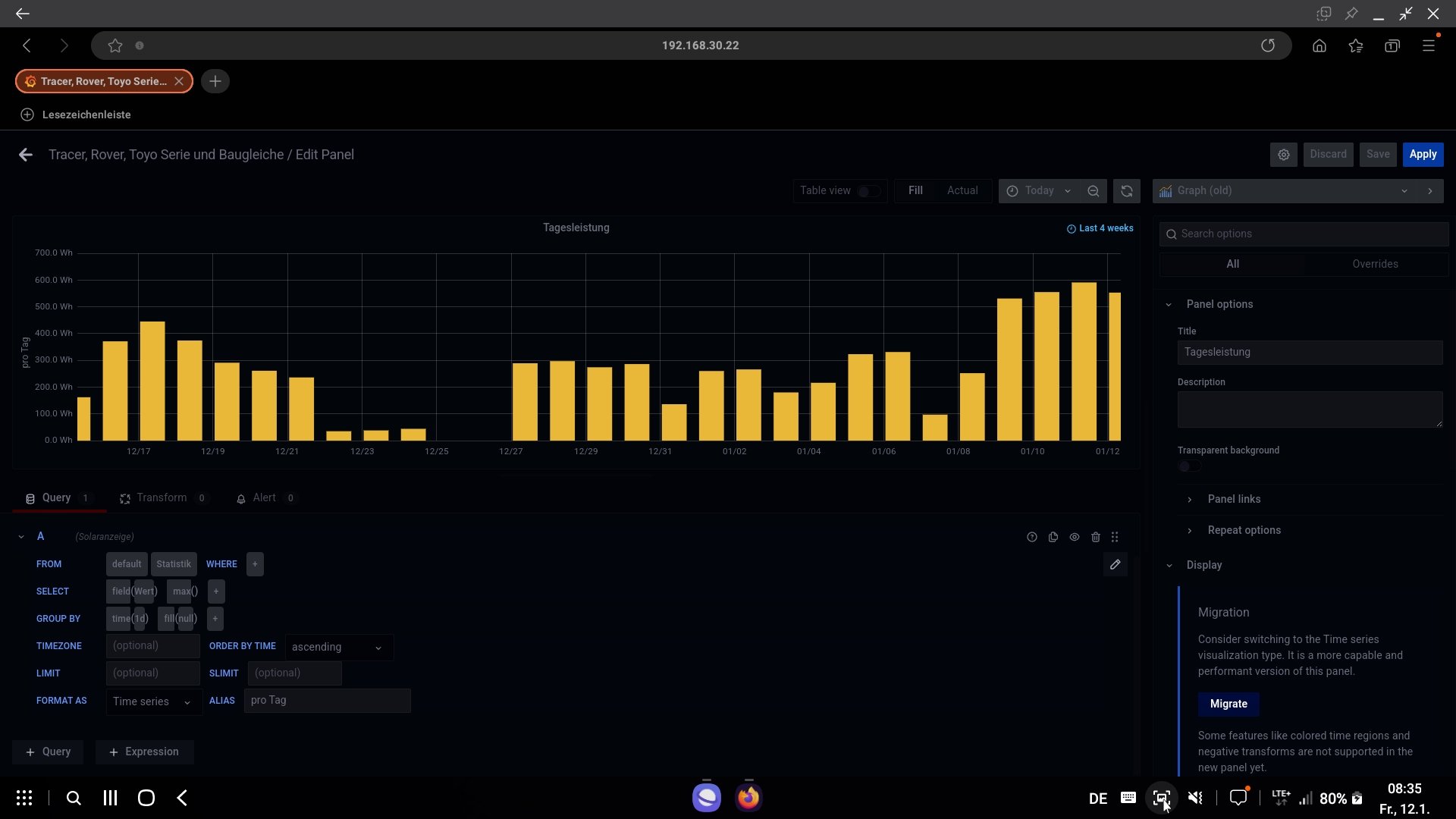 Zuerst hier die Bilder von der Version als noch alles Funktioniert hatte. Es gibt in der Neueren "Solaranzeige" Version also der neuen Grafana Version die Anzeige Graph (old) anscheinend
