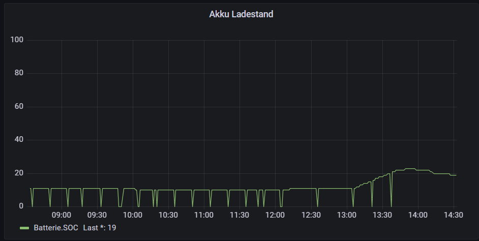 ich habe da doch noch einen Fehler, der sich aber beheben lassen sollte. Jeden Morgen, wenn der Wechselrichter aufwacht, habe ich einen Akkuladestand von 6554%.