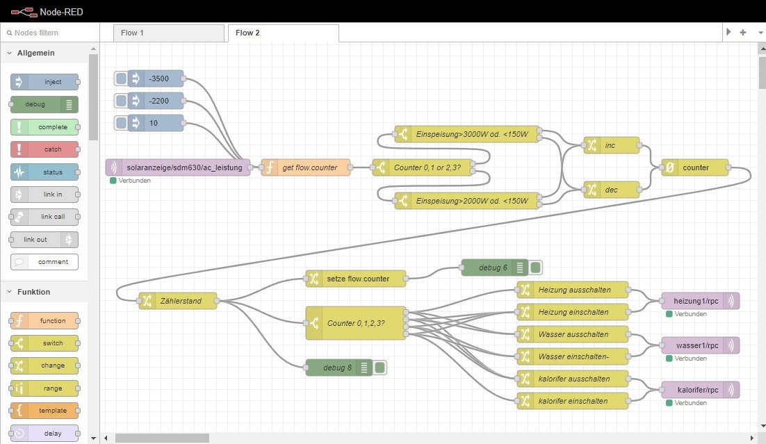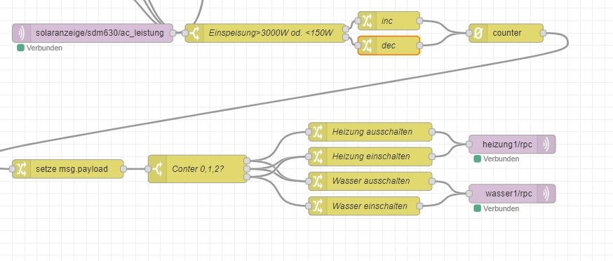 Da ich bei mir schon Node-Red nachinstalliert hatte, habe ich es mal damit versucht und bin auf folgende Lösung gekommen: Der Zähler ist von 0 bis 2 begrenzt. Die Shellys werden per MQTT geschaltet. Sie bedienen zwei Elektroheizstäbe mit jeweils 3000W.