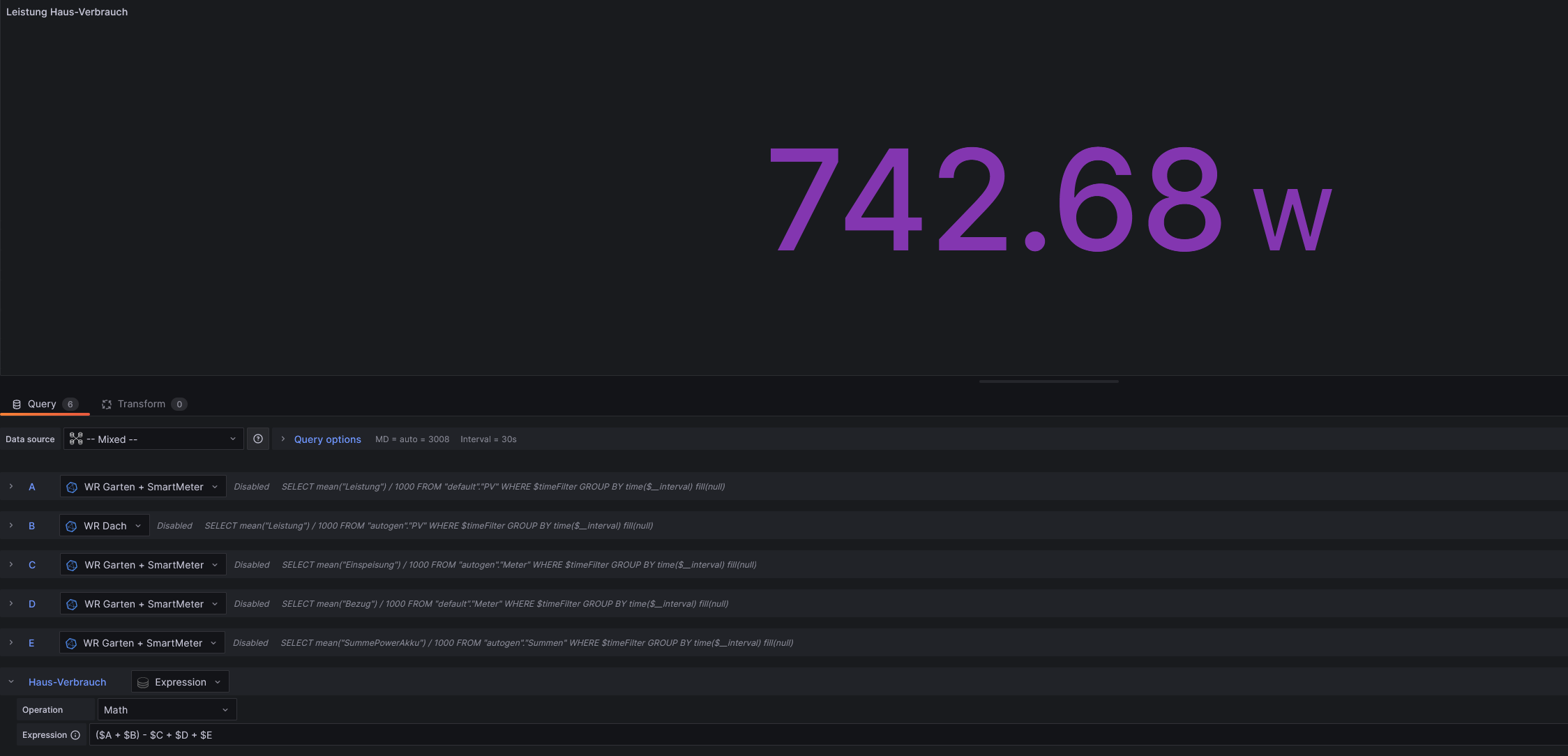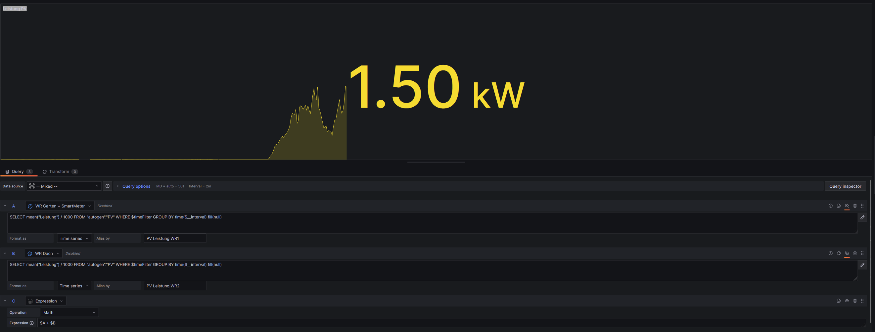 Problematik in Grafana, wenn ein WR temporär keine Daten liefert (warum auch immer) dann funktioniert die Berechnung in Grafana leider nicht.. zumindest wie ich es in Erinnerung habe.