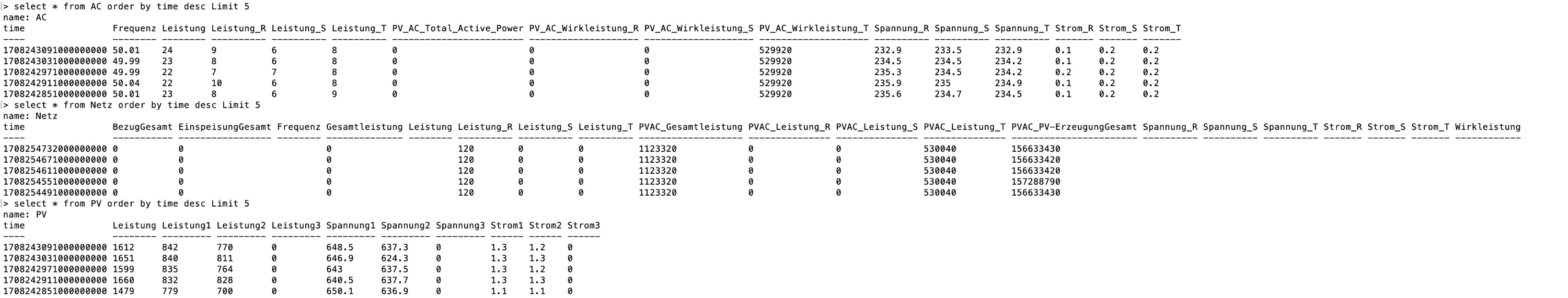 Hier ein Auszug aus der Influx Datenbank: Im Measurement "AC" sind Gesamtleistung sowie die Leistungen R,S,T unrealistisch.