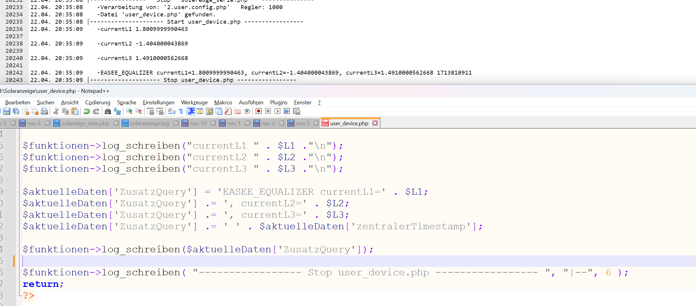 Im Screenshot ist oben der Auszug aus dem solaranzeige.log und darunter der entsprechende Codeabschnitt aus user_device.php