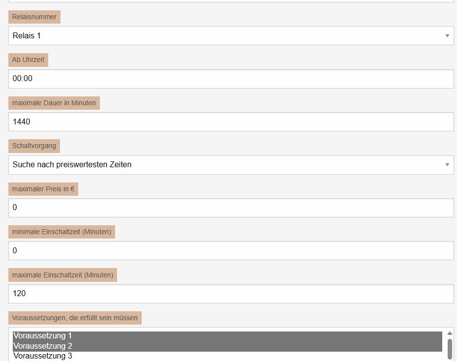 Ich habe "minimale Einschaltzeit = 0" und "maximale Einschaltzeit = 120" eingetragen. Ich habe das aus der Doku so verstanden, dass das Relais maximal 2 Stunden in den preiswerten Stunden schaltet, aber nur, wenn beide Voraussetzungen auch erfüllt sind. Wo ist mein Denkfehler?