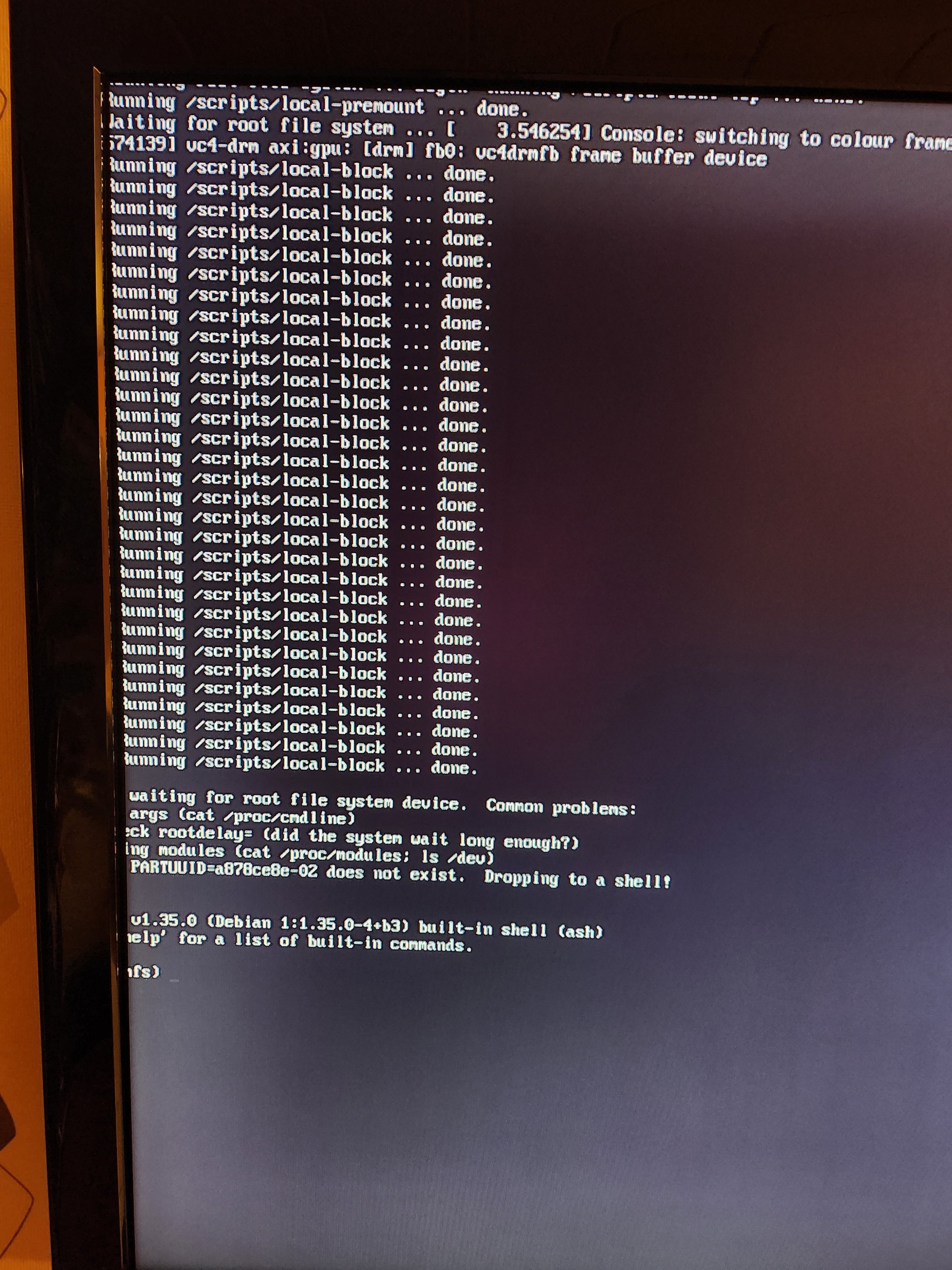 Siehe Bild (ja, da ist ein bißchen overscanning....einmal gestartet nach der 1. Install. habe ich deshalb über Putty drauf zugegriffen...)