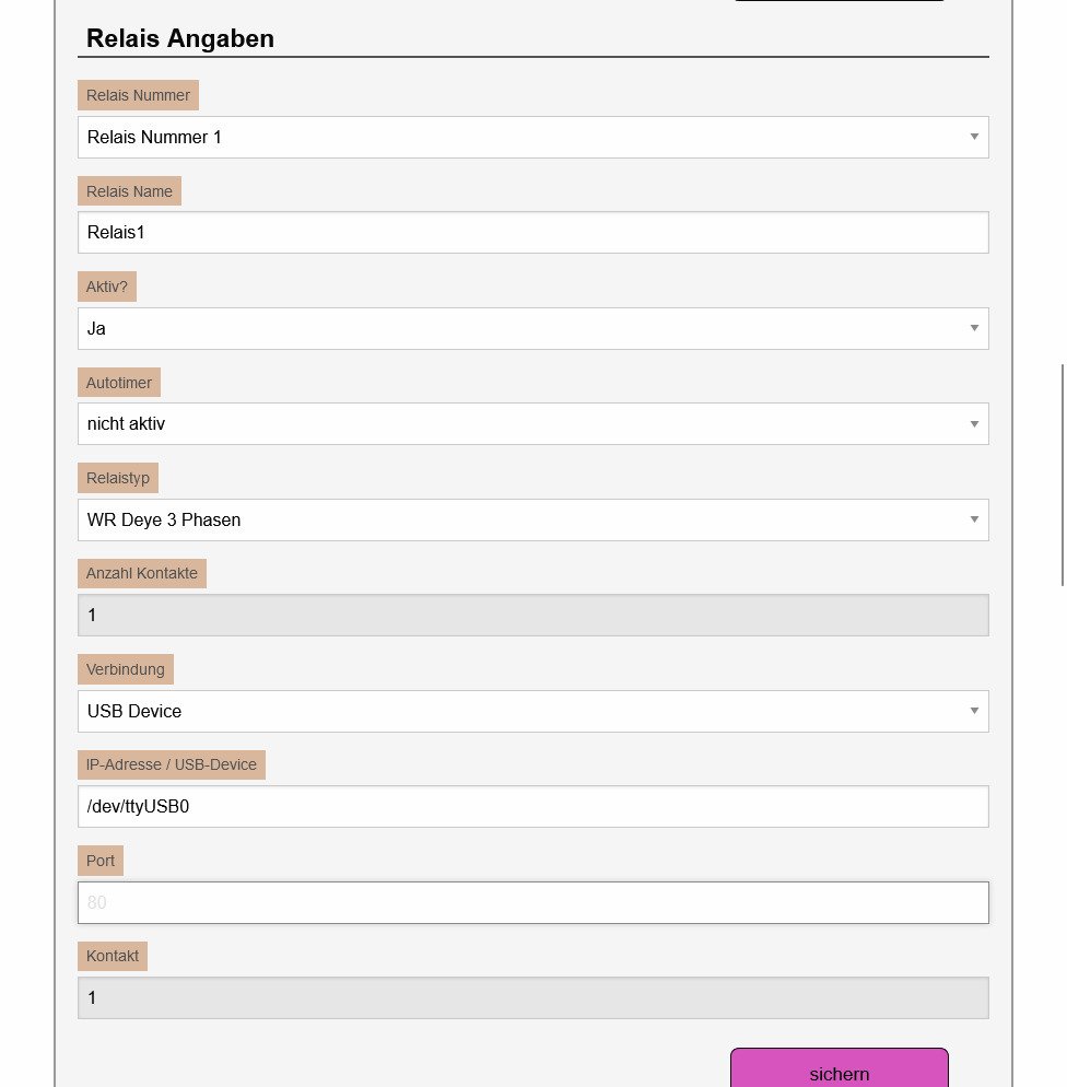 In der SGS Konfiguration [sgs.ini, sofern man sie benutzt] muss als Relais Typ "Deye3P" angegeben werden, als Protokoll "USB", Kontaknummer = MODBUS-ID und als IP-Adresse die USB Device "/dev/ttyUSBx"