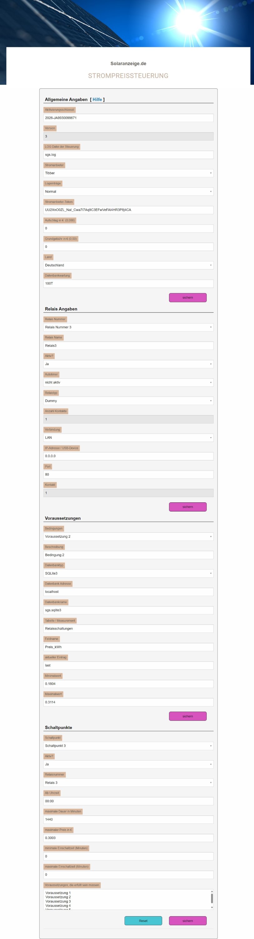 Es sind jetzt nicht mehr einzelne Seiten, sondern alles ist auf einer Seite untereinander angeordnet, was die Bedienung mit einem Handy etwas vereinfacht. Die genaue Beschreibung der einzelnen Felder ist in diesem Dokument beschrieben. Wer die neue Version 3 benutzen will, muss die SGS noch einmal neu installieren, so wie im Dokument auf Seite 7 beschrieben.