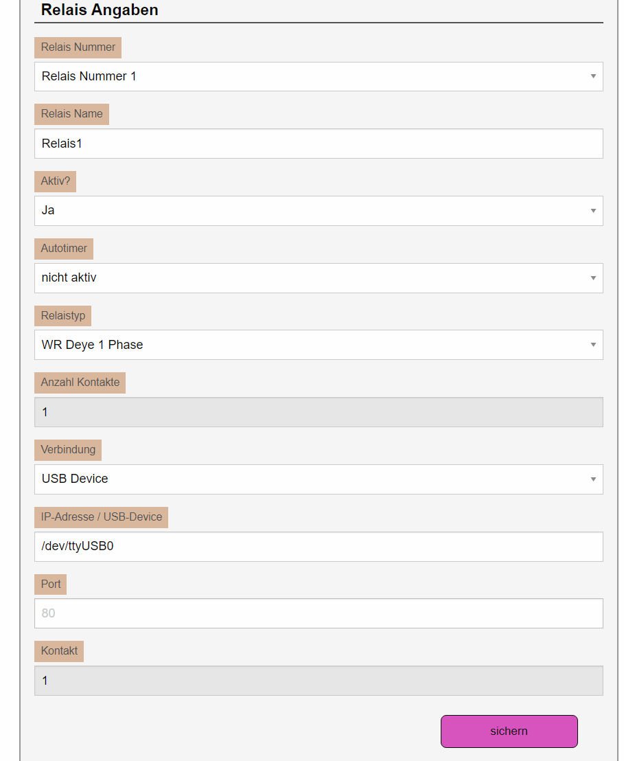 In der SGS Konfiguration [sgs.ini, sofern man sie benutzt] muss als Relais Typ "Deye1P" angegeben werden, als Protokoll "USB", Kontaknummer = MODBUS-ID und als IP-Adresse die USB Device "/dev/ttyUSBx"
