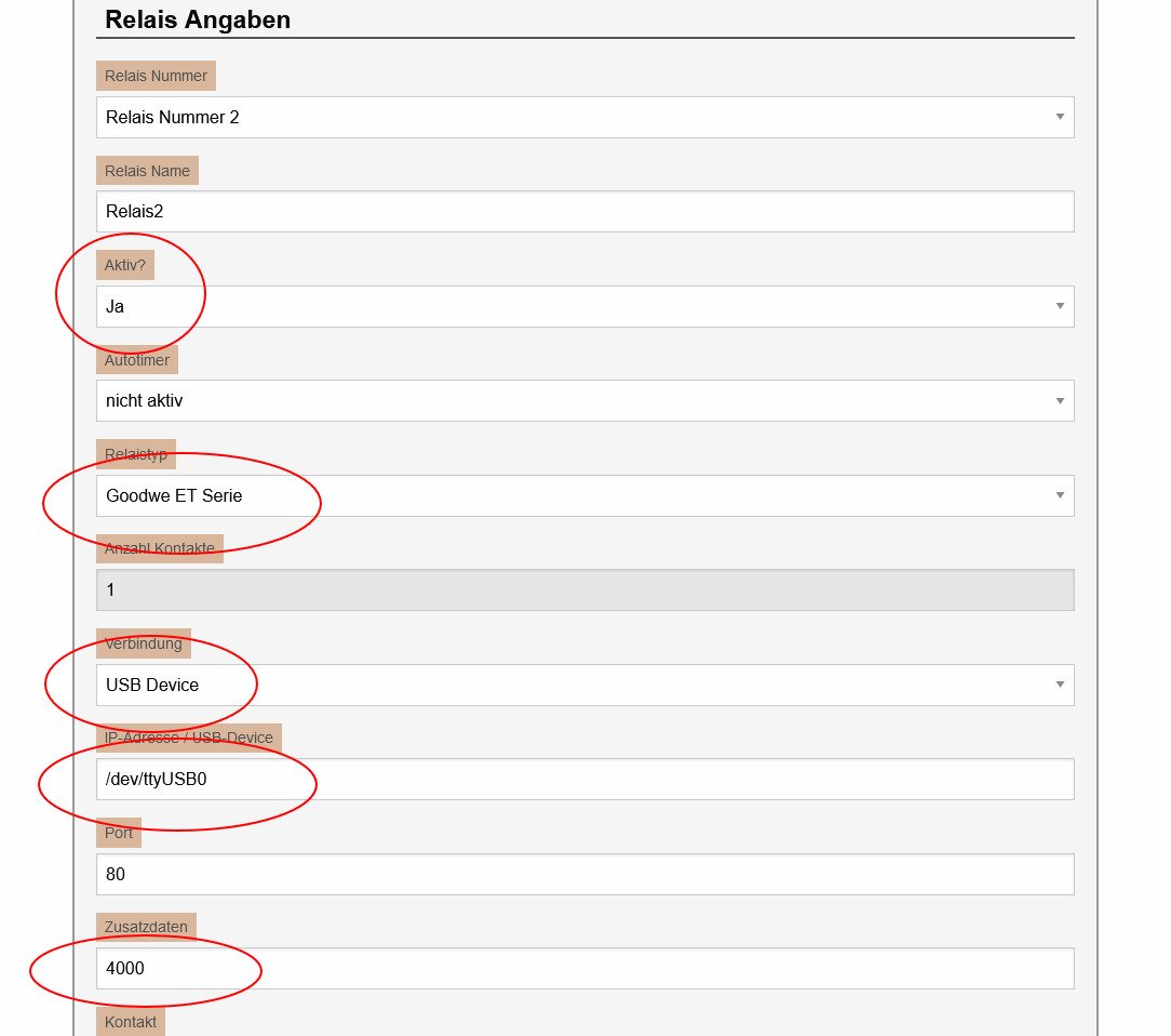 So muss das "Relais = Goodwe ET Serie" eingetragen werden. Die Device USB Adresse natürlich anpassen. (/dev/ttyUSBx) In dem Feld "Zusatzdaten" kann die maximale Ladeleistung in Watt eingetragen werden. Wird nichts eingetragen, wird mit maximal 5000 Watt (5kW) geladen. Das ist nur der Maximalwert. Die tatsächliche Ladeleistung bestimmt der Wechselrichter.