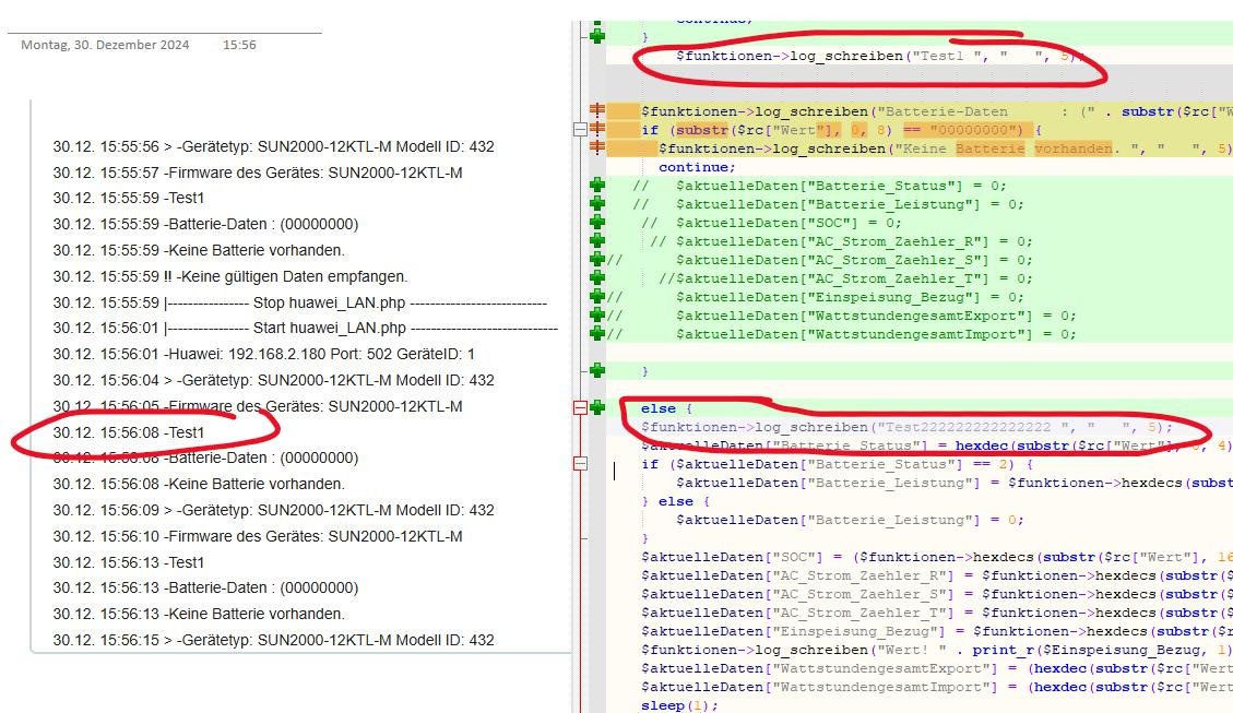 Sobald ich in den ersten Teil der Schleife mit Batterie-Daten "00000000" einbiege, wir "Einspeisung_Bezug" auf 0 gesetzt und im weiteren Verlauf nie wieder abgefragt. Und genau daraus wird der Hausverbrauch ja berechnet.