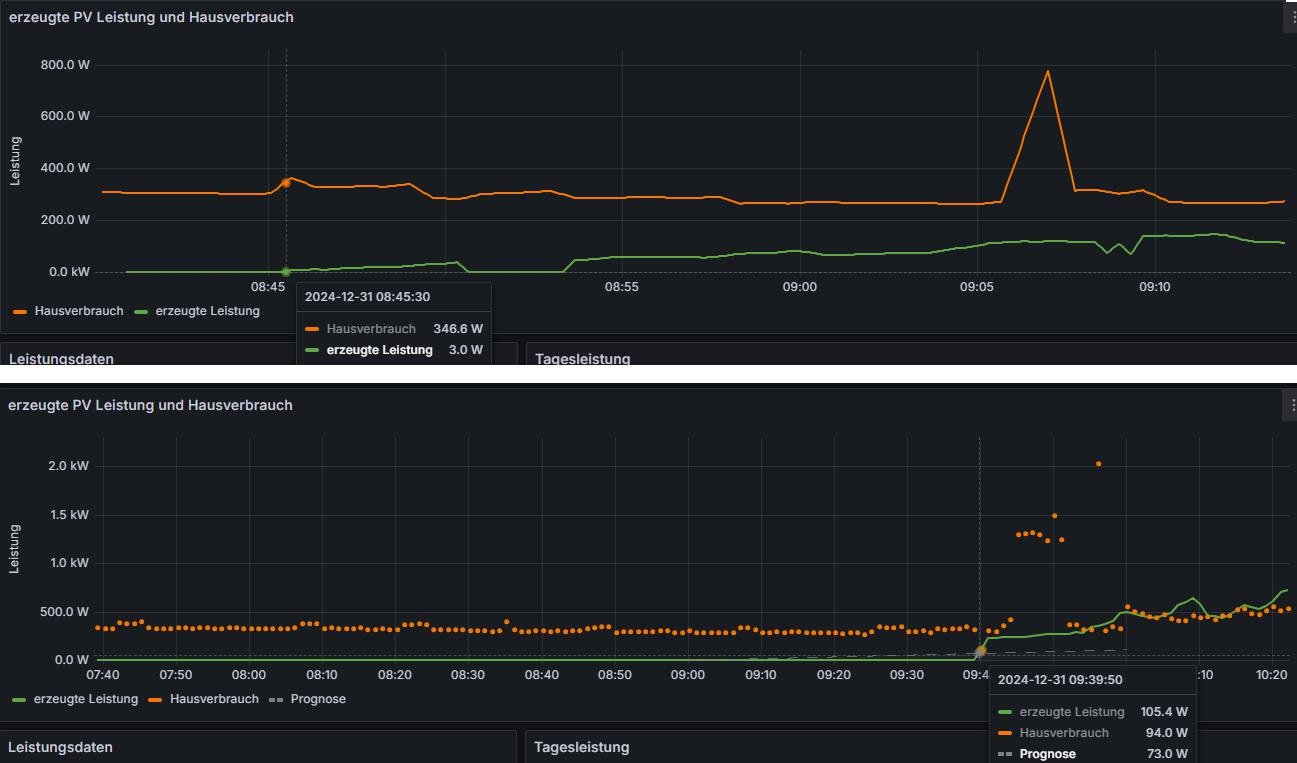 Es gibt immer noch einen Unterschied. Solaranzeige fängt erst eine Stunde später an, Daten der PV-Anlage zu speichern. Auch erkennbar an dem Sprung der Daten um 09:39. Ich versuche mir das nächstes Jahr mal anzuschauen. Dazu brauche ich dann aber genau die Sonnenaufgangszeit ;)