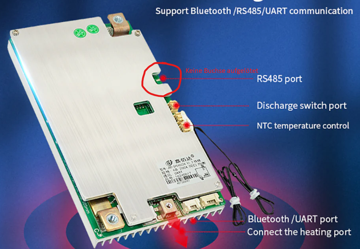 Dort ist kein RS485-Anschluss verbaut, sondern nur der UART-Anschluss (dort hängt normalerweise ein BT-Modul dran, das funktoniert auch, welches ich aber abschaffen will).