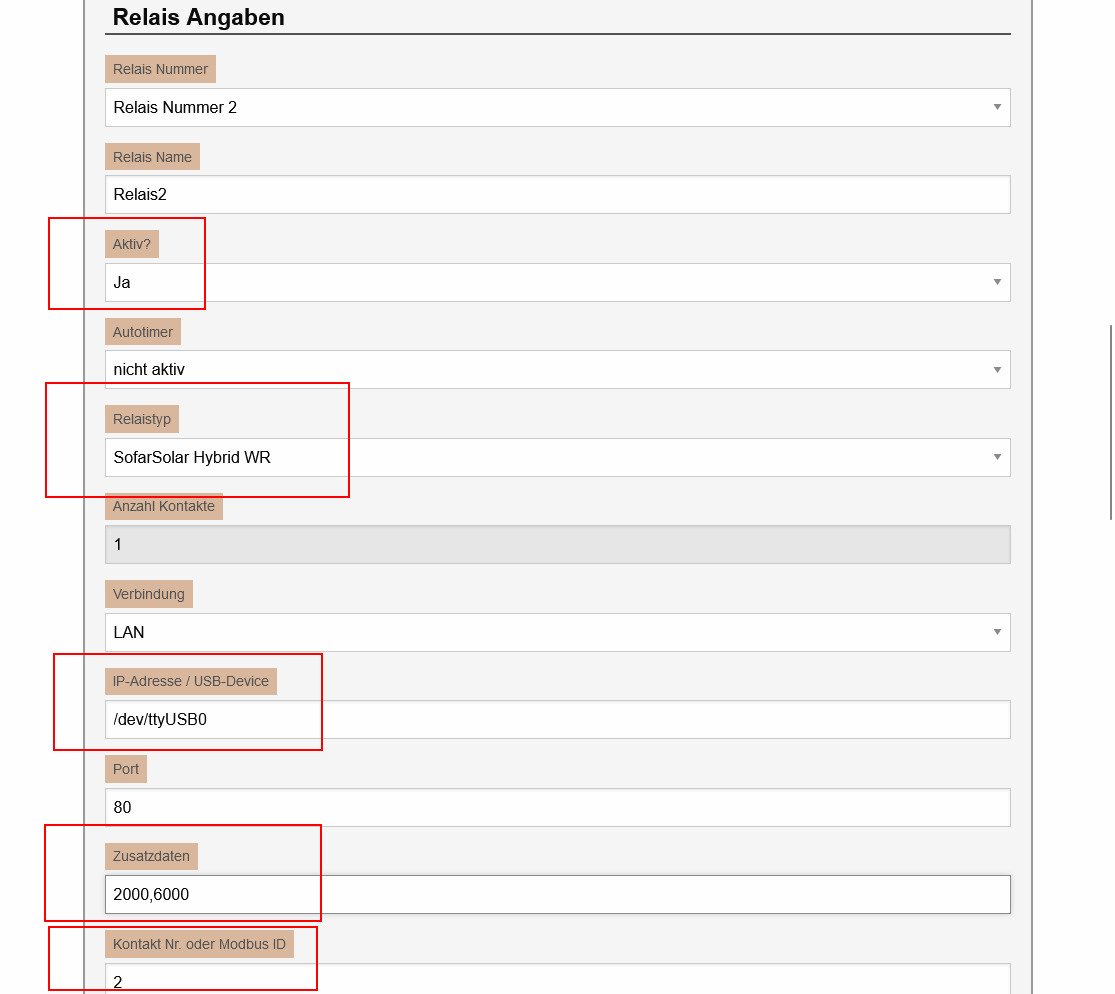 So muss das "Relais = Sofar Hybrid WR" eingetragen werden. Die Device USB Adresse natürlich anpassen. (/dev/ttyUSBx) In dem Feld "Zusatzdaten" kann die maximale Ladeleistung in Watt eingetragen werden. Wird nichts eingetragen, wird mit maximal 5000 Watt (5kW) geladen. Das ist nur der Maximalwert. Die tatsächliche Ladeleistung bestimmt der Wechselrichter.