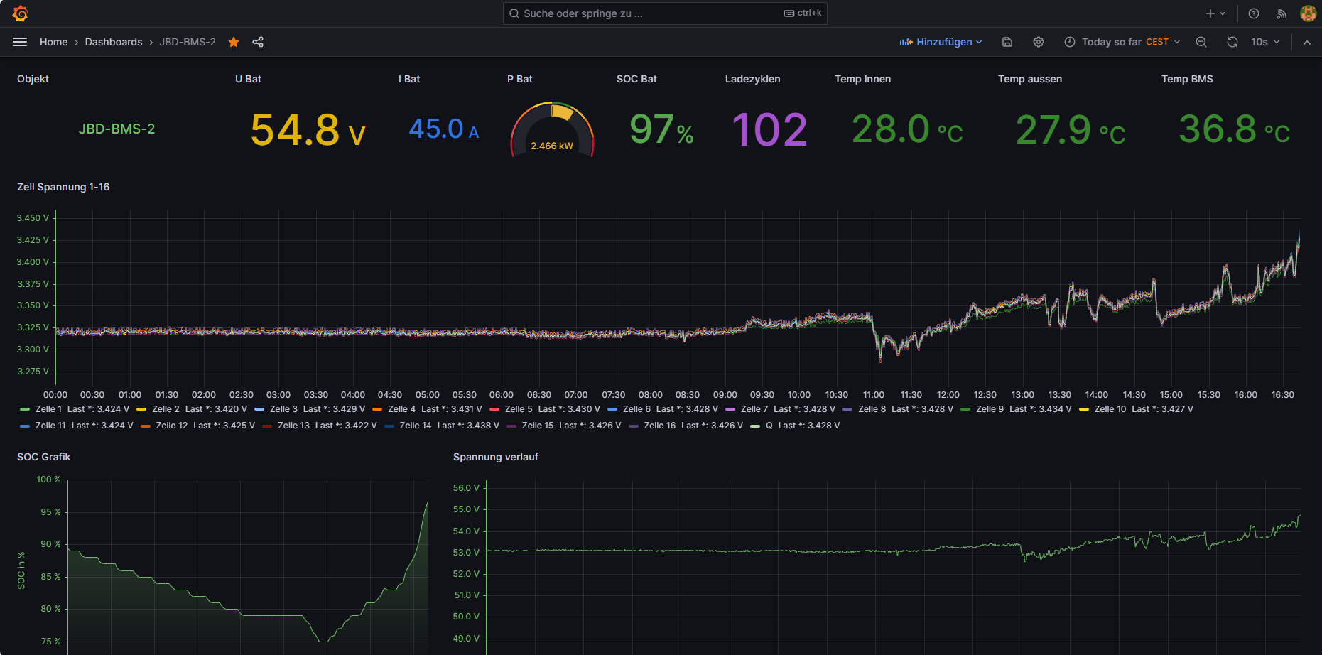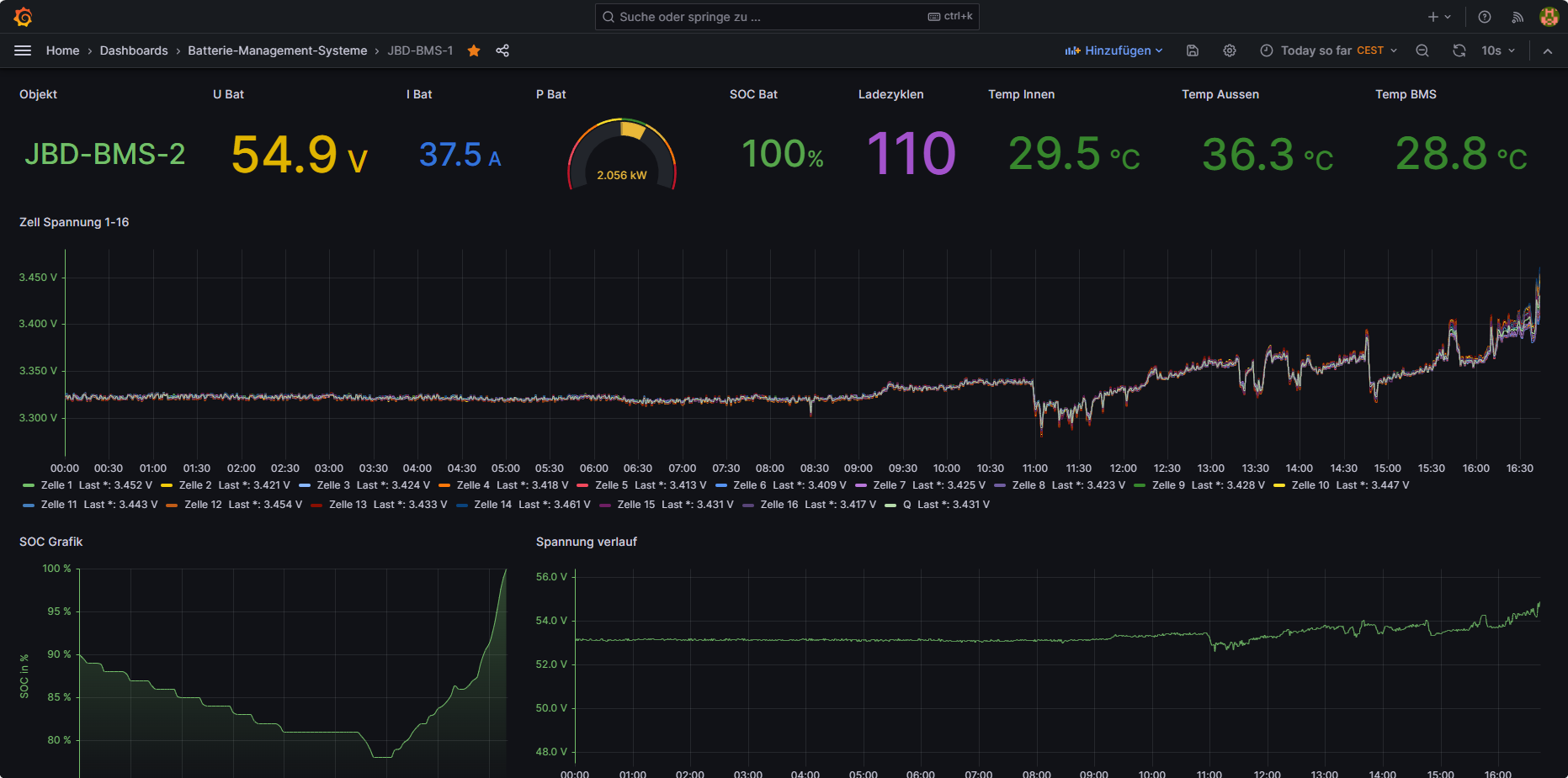 Ich überwache alle Zellen einzeln in einer Grafik somit sind auch ausreißer gut zu erkennen und wie du siehst steht er kurz vor der Vollen Ladung die bei mir nur bis 56 V geht das reicht uch zum Balancieren der Zellen.