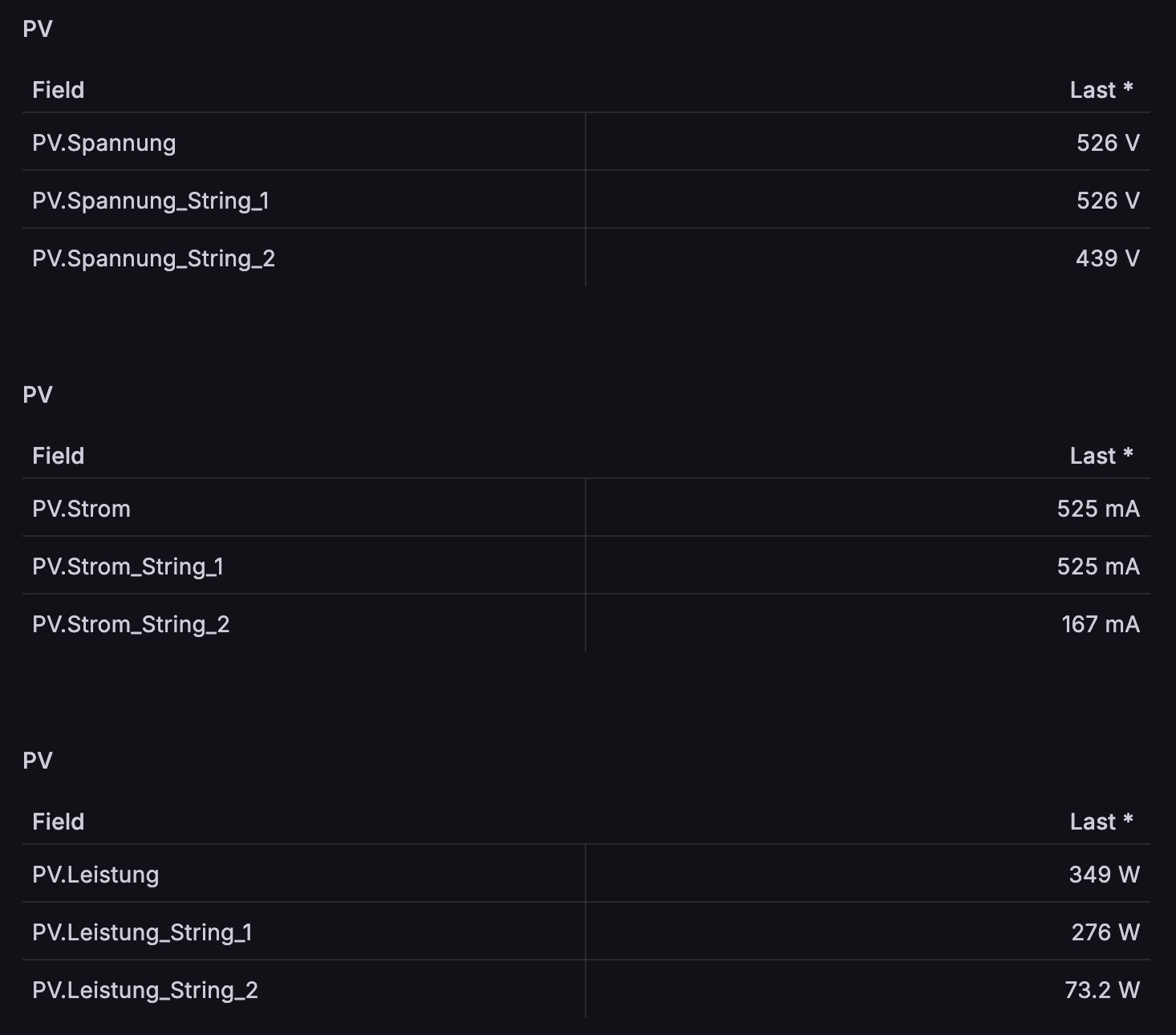 Außerdem ist es falsch, dass PV.[Spannung,Strom] die Summe von PV.[Spannung,Strom]_String_ 1 und PV.[Spannung,Strom]_String_ 2 sei. Bei PV.Leistung scheit das zu stimmen: