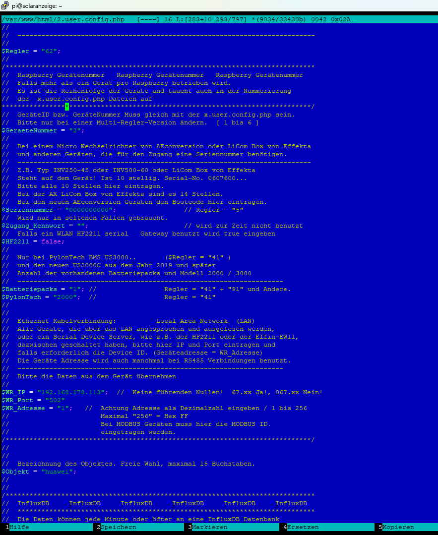 Was habe ich gemacht: Solaranzeige zuerst normal mit meinem Plenticore konfiguriert und nachdem das alles ohne Probleme in Grafana lief, wollte ich nun meinen Huawei 6KTL hinzufügen. Habe in der 2.user.config.php eine neue Datenbank mit Solaranzeige1 erstellt und $GeraeteNummer = "1"; in "2" geändert. Da $USBDevice = "/dev/ttyUSB0"; habe ich "Ethernet" eingetragen. $InfluxDBLokal = "solaranzeige"; auf "Solaranzeige1" geändert. Dann IP und Port des Huawei WR eingefügt und gespeichert und fertig. Wenn ich jetzt aber wieder /var/www/html/2.user.config.php aufrufe ist das Fenster nur blau ohne Kommentare... Hilfe.. Wo fange ich an zu suchen?Kann ich jetzt einfach nochmal alle Schritte aus der Anleitung machen oder muss ich vorher was löschen?