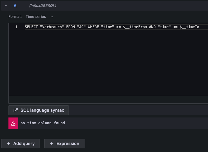 Wegen der Einschränkungen dieser Query Sprache habe ich mal "SQL" benutzt, auch da werden wohl Daten geschrieben von der Solaranzeige; leider kann ich aktuell nur Tabellen anzeigen, keine Timeseries. Es kommt folgender Fehler: