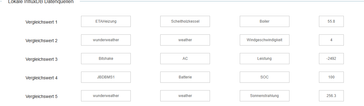 Vorgesehen sind bis zu 5 Werte aus lokalen Influx Datenbanken. (Zahlenwerte + Boolean)