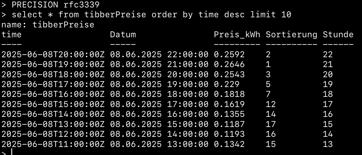 Ulrich: könntest du nicht irgendwie, für Nutzer wie mich, die Tibber-Preise in die influx DB einlesen lassen? Ich persönlich brauche das ganze Schalter-Zeug nicht. Und ab demnächst bieten alle Stromanbieter einen Stunden-Vertrag an, d.h. alle werden umstellen müssen.