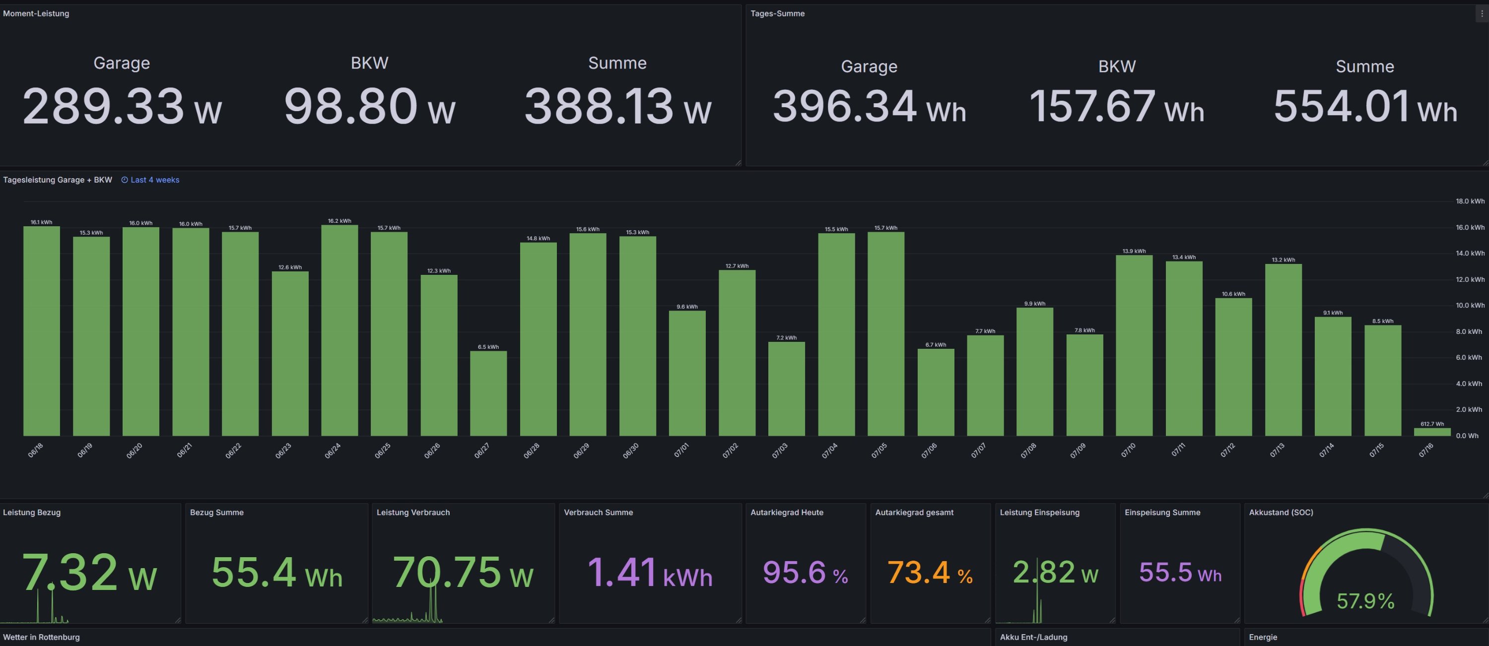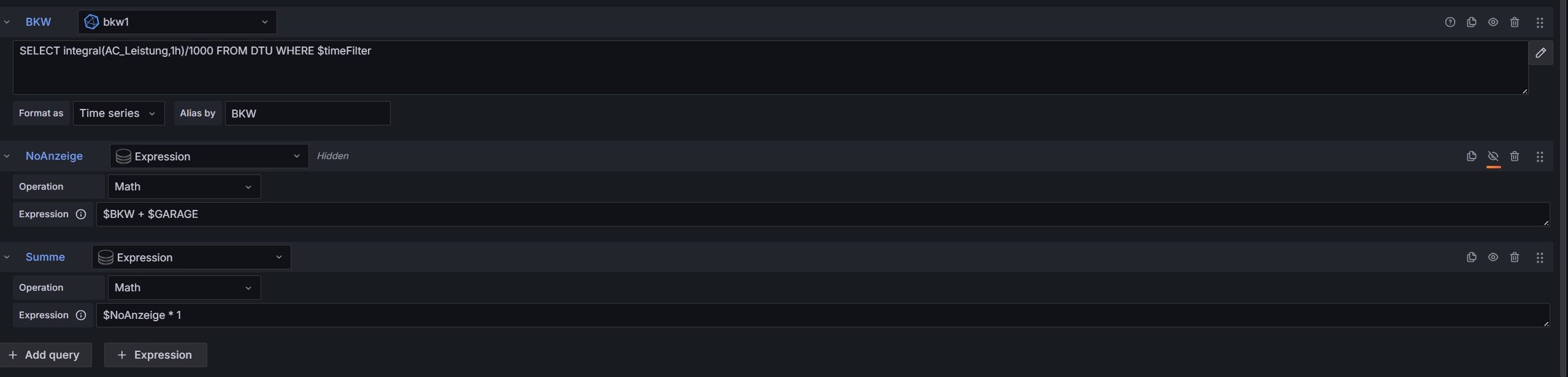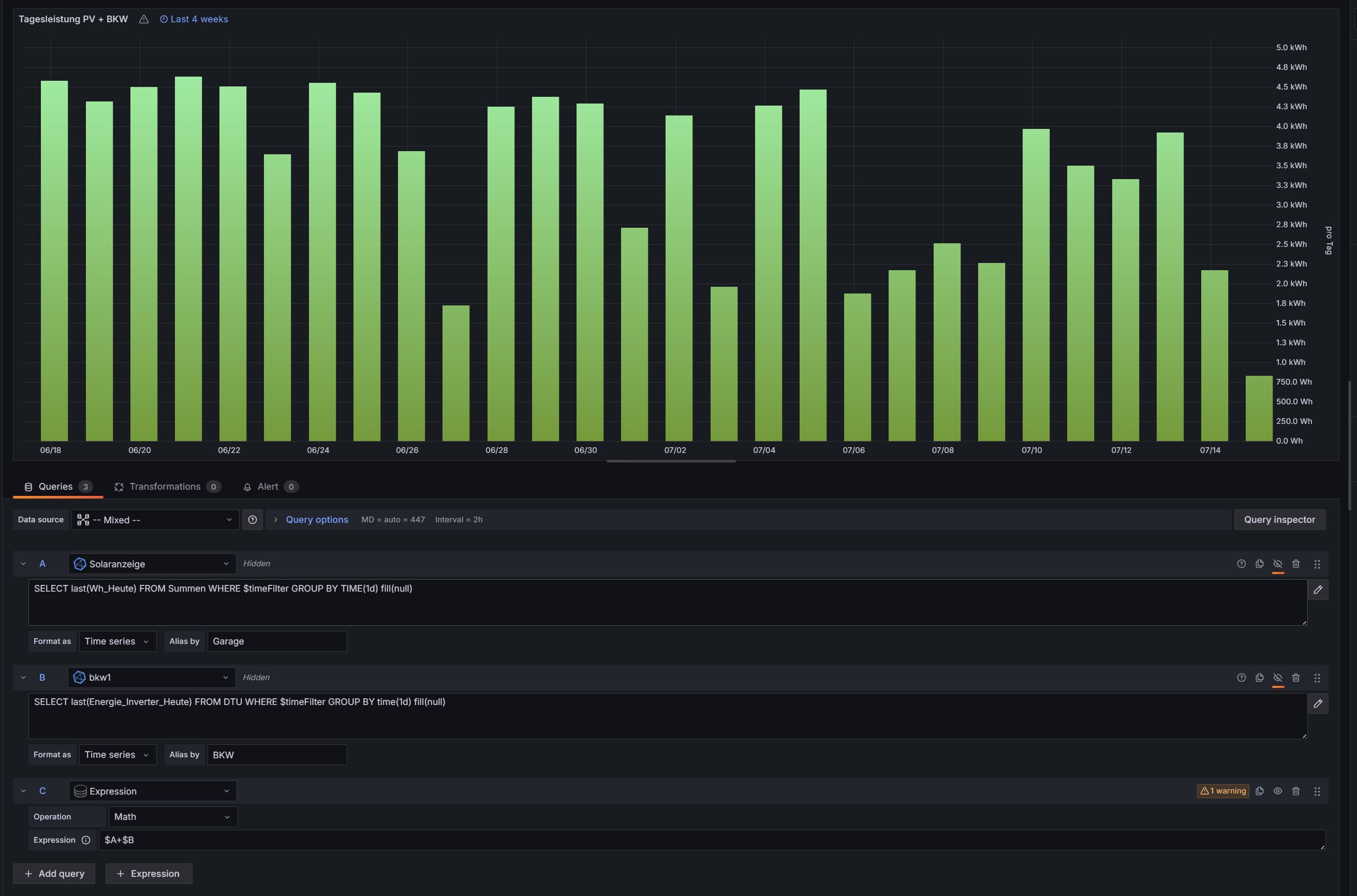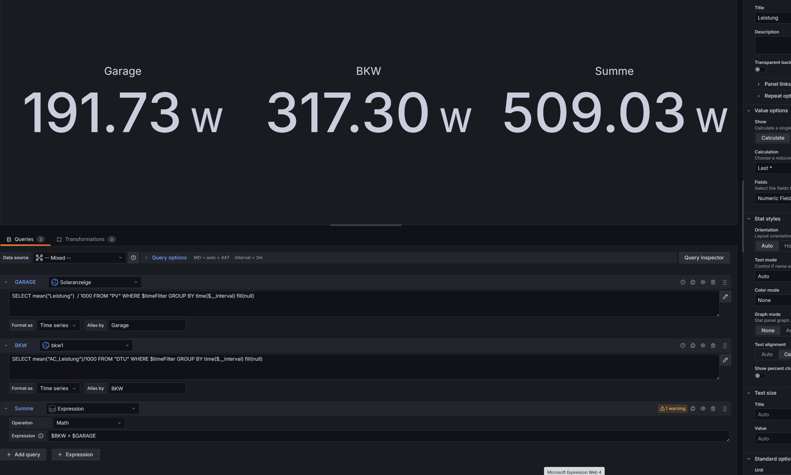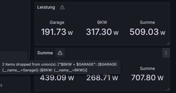 Nun meine Probleme: Ich habe die Solaranzeige um die Werte der OpenDTU und der Fronius Symo Gen24 Plus auf einer Oberfläche darstellen zu können. Bei den einzelnen geht das auch sehr einfach aber, sobald ich summieren möchte, gibt es Probleme. Die Darstellung der Zahlen stimmen zwar aber oben wird ein Ausrufezeichen dargestellt. Das sieht nicht so schön aus.