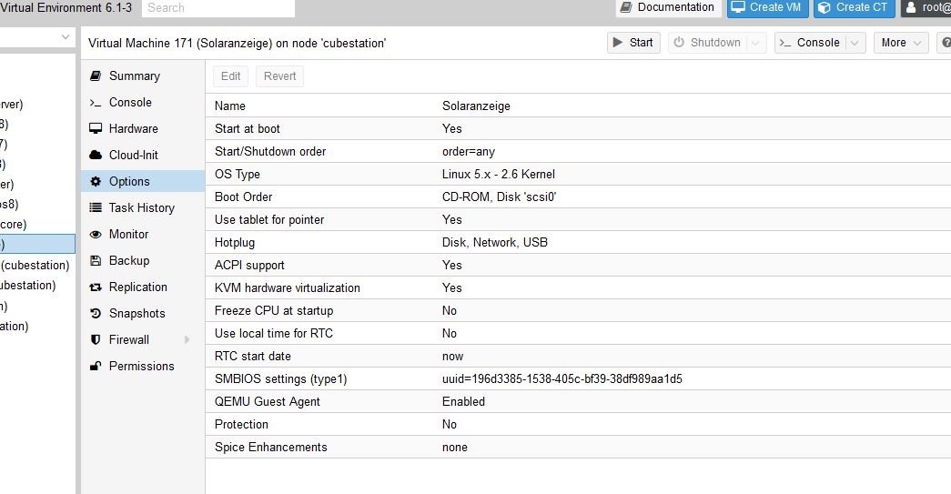 der Raspberry, für den das Solaranzeige-Image gebaut ist, hat eine ARM-Architektur. Da Deine Proxmox-Installation vermutlich auf einer x86_64-Büchse läuft, wird das ohne geringfügigste Anpassungen nicht funktionieren. Die Installation des Paketes "qemu-system-arm" erweitert Deine Proxmox-Installation um die Fähigkeit, auch ARM-Systeme starten zu können. Es kann sogar sein, daß die Proxmox-Installation diese Fähigkeit bereits mitbringt; je nachdem wie und was Du da bereits installiert hast. Wenn Du mit diesem Ansatz weiter machen möchtest, könnten Deine Suchwörter in der Suchmaschine Deiner Wahl sein: "proxmox + vm on arm".