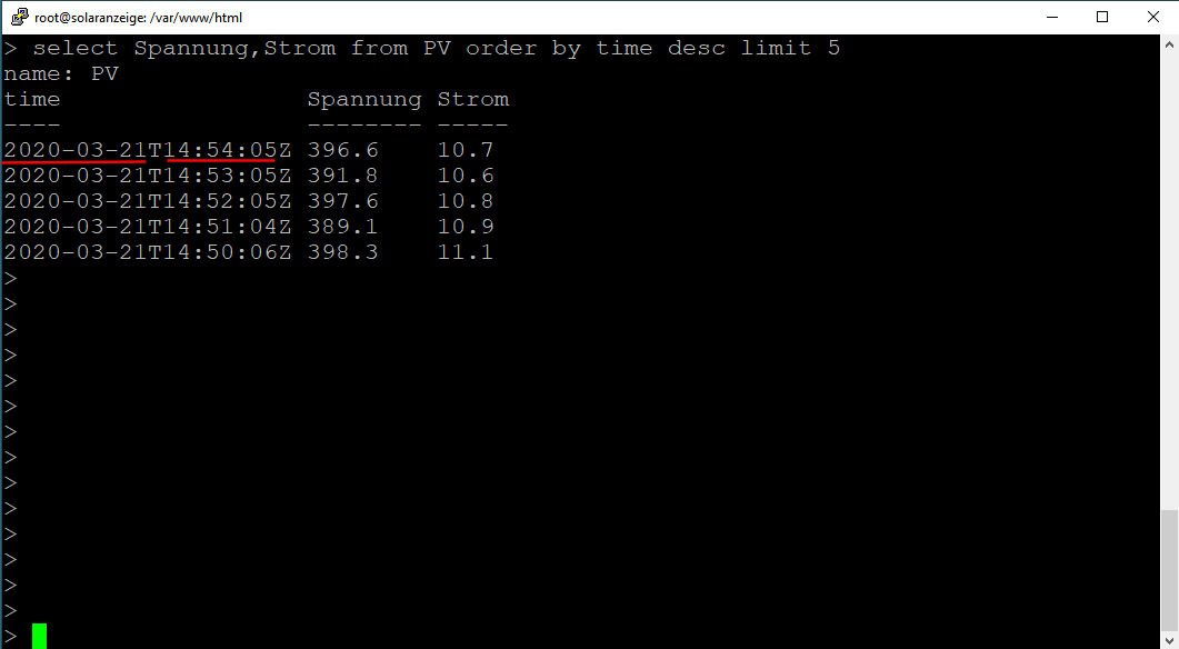 Jetzt die letzten eingetragenen Daten aufrufen mit: "select Spannung,Strom from PV order by time desc limit 5"