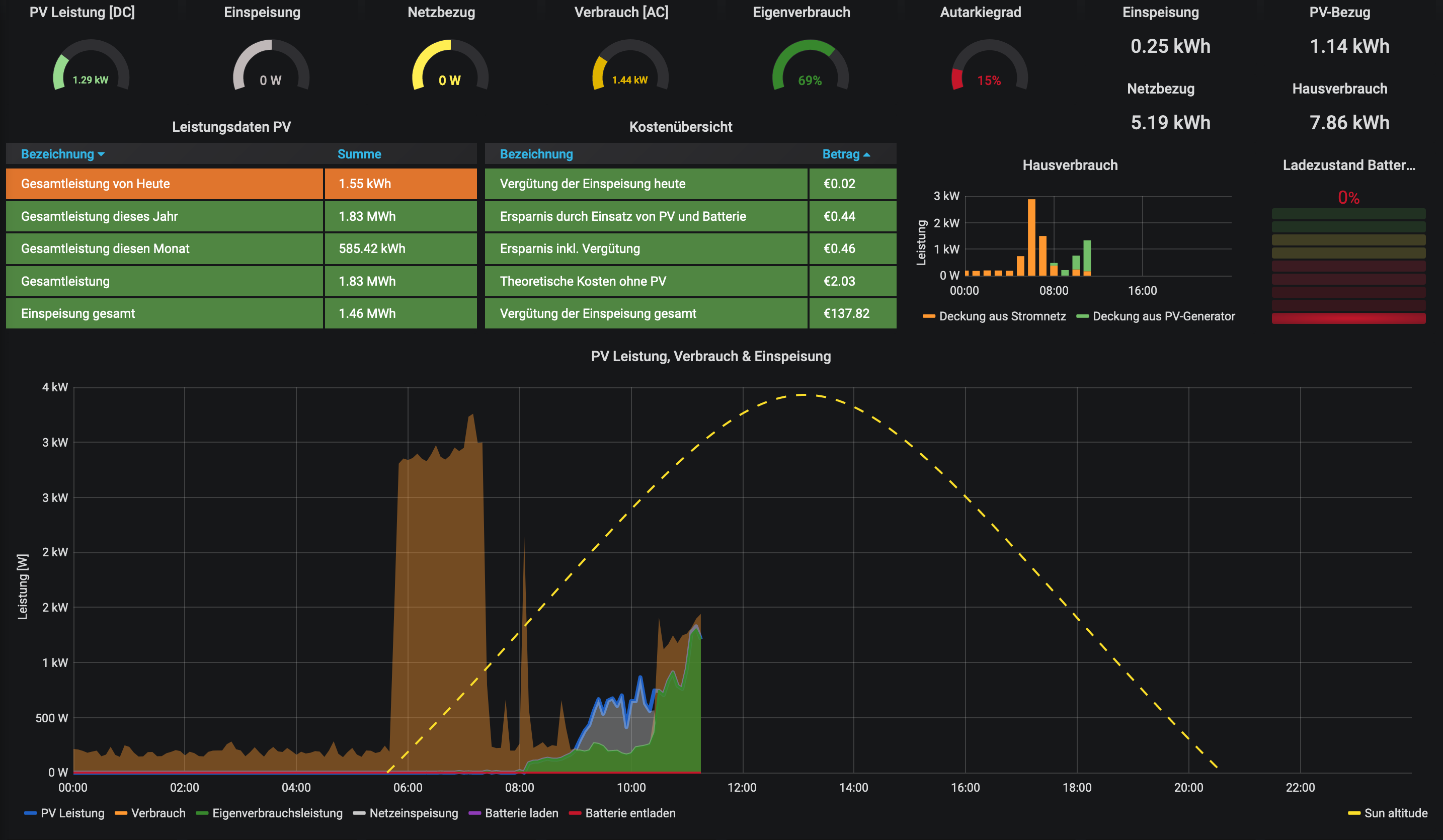 Außerdem nochmal ein Bild von meinem Dashboard, wo man sieht, dass eigentlich Netzbezug (also Leistung_pos) bestehen müsste. Dieser ist jedoch 0 (oder keine Daten?).