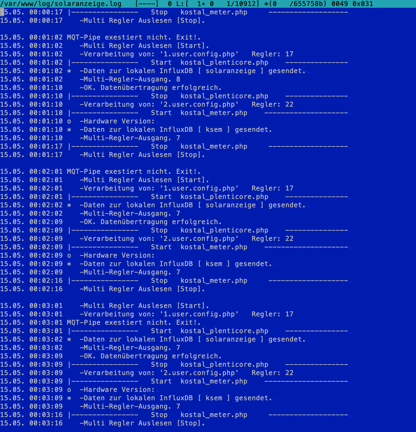 Wie aus den LOG Dateien zu sehen ist, werden wirklich jede Minute Daten abgespeichert. Dann werden sie auch so aus dem Gerät gelesen. Wenn das Gerät keine Daten heraus gibt, würde auch der Eintrag in der Datenbank fehlen. D.h. den Fehler müsste man im Gerät oder in der Übertragung zum Raspberry suchen.