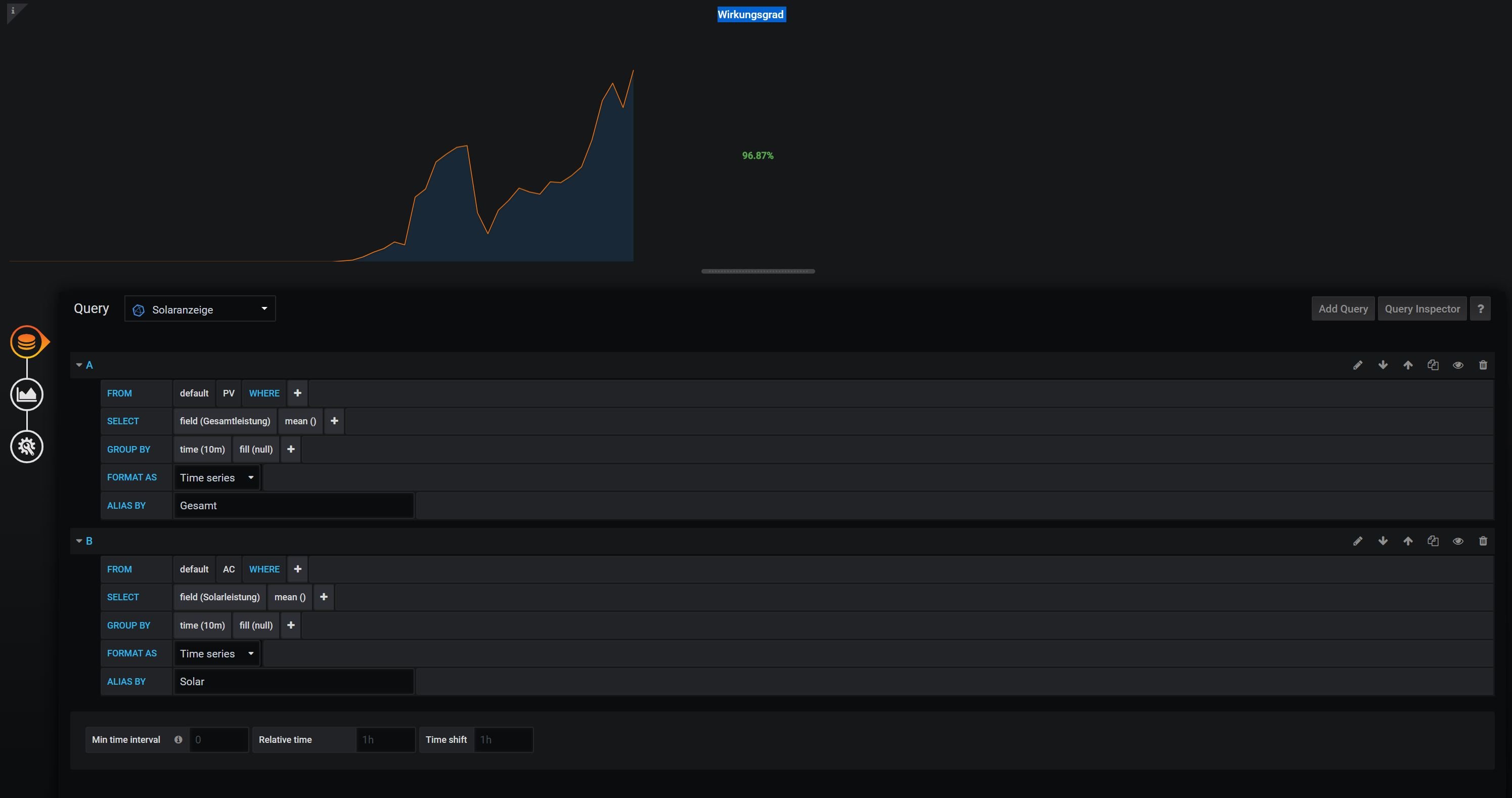 Für einen Kostal Plenticore WR steht unter der Serie "PV" der Wert "Gesamtleistung" der PV-Anlage, unter AC der Wert "Solarleistung" nach Umwandlung durch den Wechselrichter zur Verfügung. Ich möchte nun in Grafana den Wirkungsgrad in Prozent anzeigen lassen, dazu muss eine Abfrage mit einer Berechnung erfolgen, welche diese Werte aus 2 verschiedenen Serien verwendet. Das scheint leider nicht zu funktionieren.