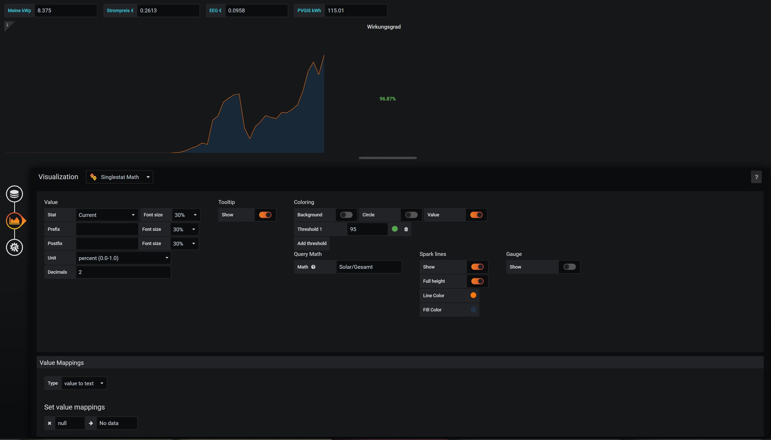 Ich habe mir jetzt erst einmal damit geholfen, dass ich die PHP-Datei zum Auslesen der Werte modifiziert habe, dort nutze ich ein Feld "Wirkleistung" um das Ergebnis meiner Berechnung zum Wirkungsgrad hineinzuschreiben. Dieses Feld hatte ich nicht genutzt und jetzt kann ich den Wirkungsgrad leicht in Grafana anzeigen...