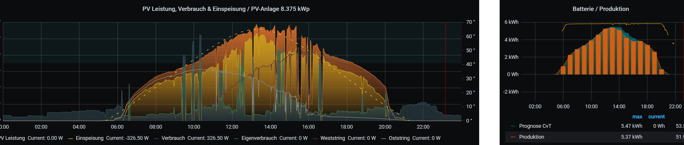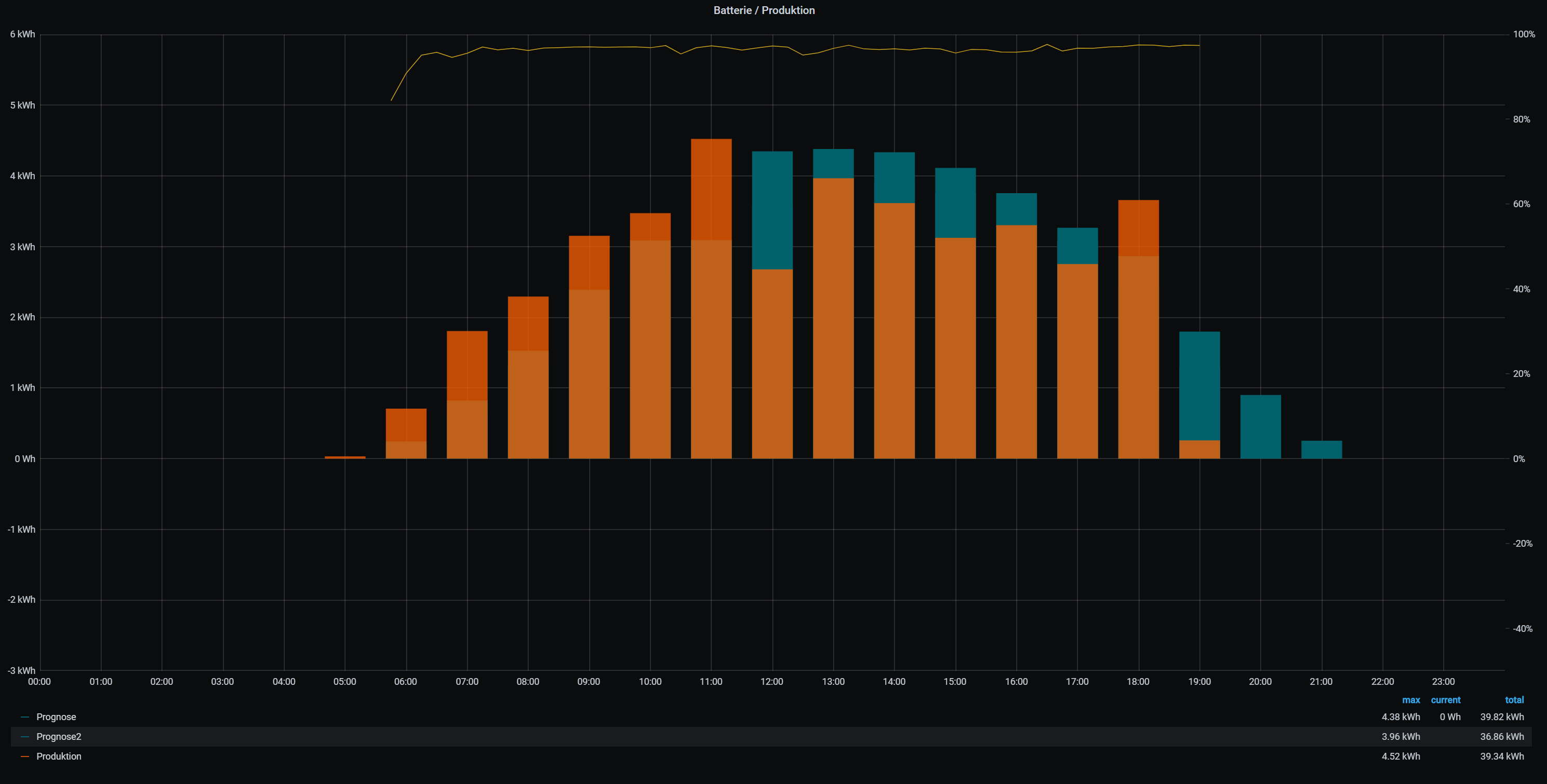 Ich nutze den Durchschnitt aus Prognose und PrognoseL (um eine Stunde versetzt und um die stündlichen Faktoren korrigiert in der prognose.php), dieser wird noch einmal mit einem Faktor im Dashboard (als Dashboard-Variable definiert) korrigiert, dieser ist aktuell bei mir 0.97.