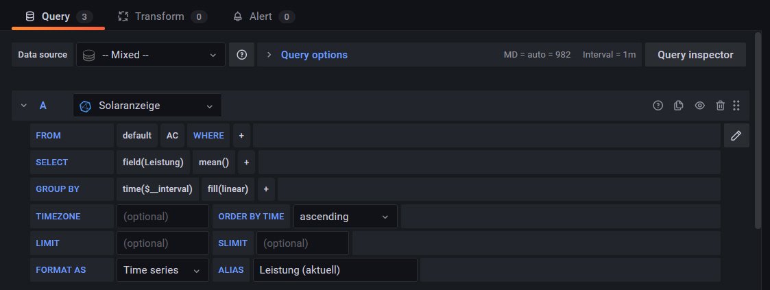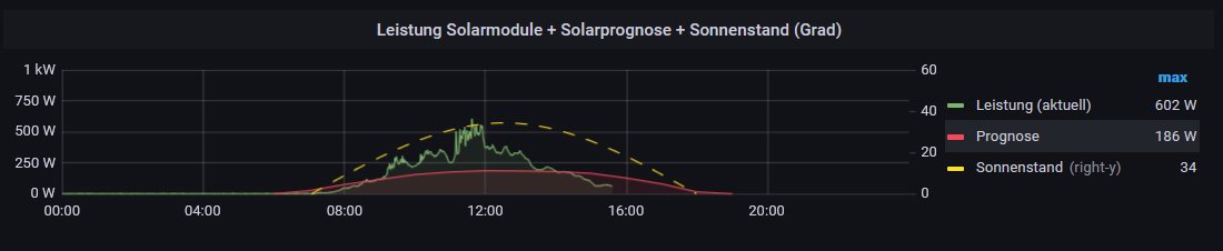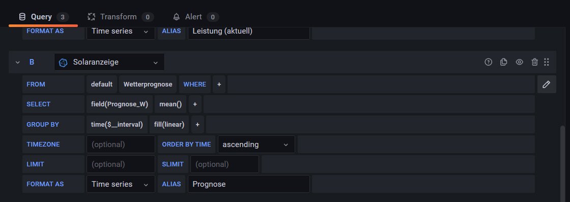 Zur Einbindung der Prognoselinie (solarprognose.de) habe ich leider nichts gefunden. Könnte mir da noch jemand helfen? Daten kommen bereits in der DB an, das habe ich mit der Anleitung prüfen können.