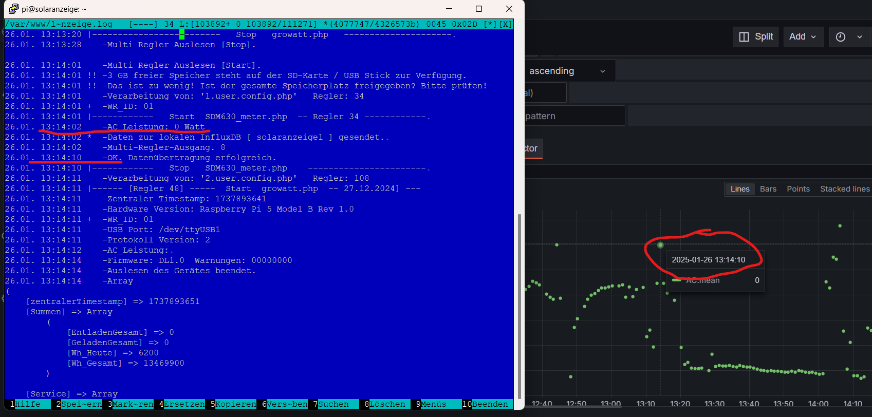 Ich bin jetzt erst seit ca. 24 Stunden am loggen, habe aber immer mal solche Aussetzer. Sowohl im Log als auch in Grafana. Beim Growatt hingegen kommt alles flüssig durch, deshalb gehe ich fast davon aus, dass es mal grundsätzlich funktioniert. Wo kann ich anfangen zu suchen? Hardware oder eher SW seitig?