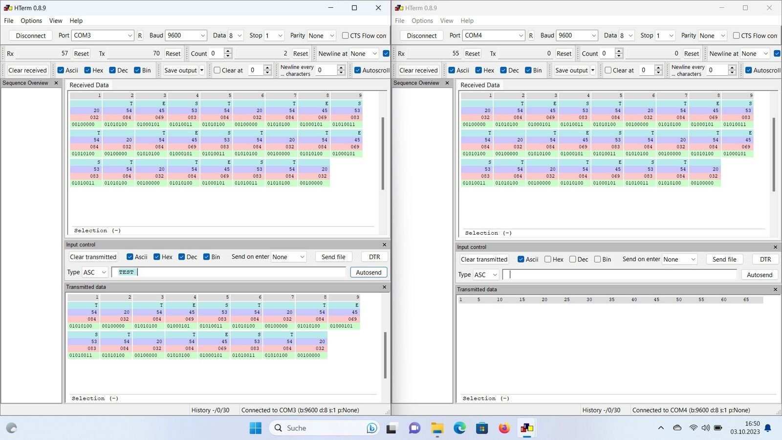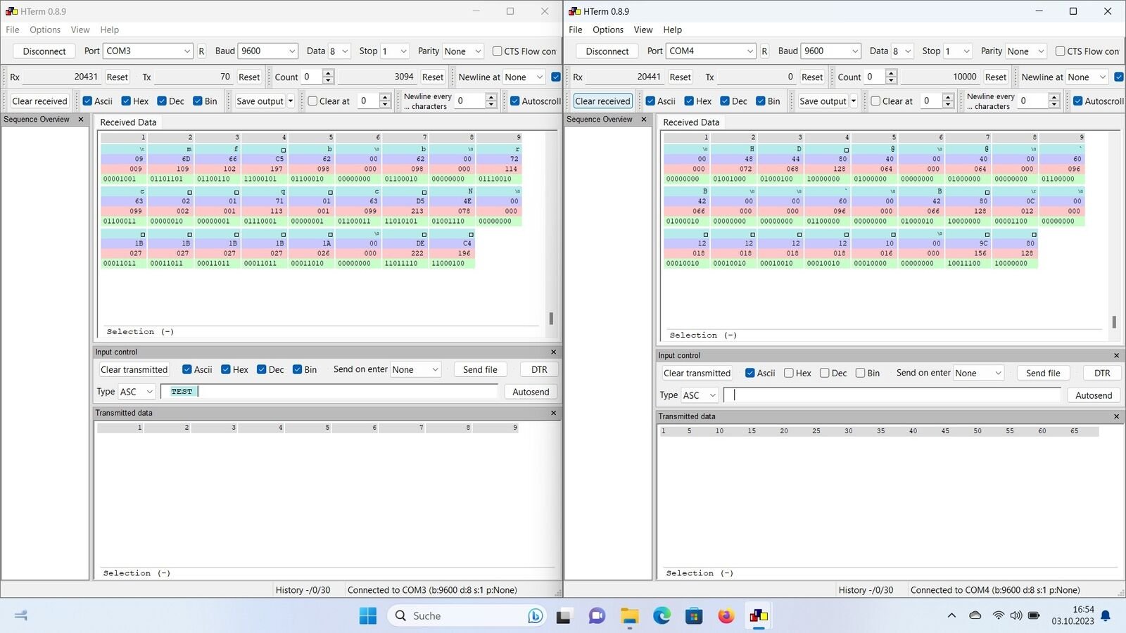 Hier mal zwei Screenshots von hterm. Linke hterm (COM3) ist die Lese-Sende-Kombination aus USB- und TTL-Kopf und das rechte hterm (COM4) ist der USB-Kopf zum auslesen der gesendeten TTL-Daten.Beim Test-Aufbau, wo der USB-Kopf sendet und gleichzeitig empfängt, sendet der TTL-Kopf dieselben Daten an den zweiten USB-Kopf.Beim Auslesen am Zähler sind es unterschiedliche Daten.