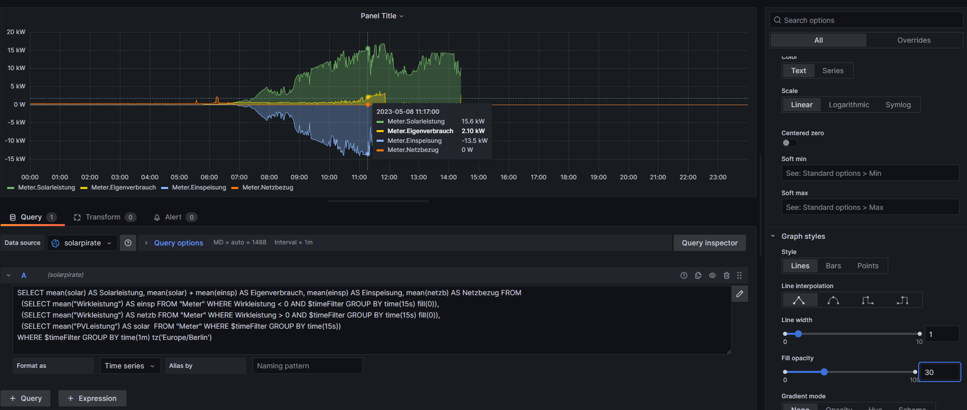 Edit: Ein Problem könnte aber sein, dass bei Dir ja die Solarleistung aus einem anderen Measurement kommt und es daher zu Problemen kommt.. Lösung wäre dann am Besten wieder alles in Einzelqueries zu schreiben und dann den Eigenverbrauch wieder via Transform zu machen.
