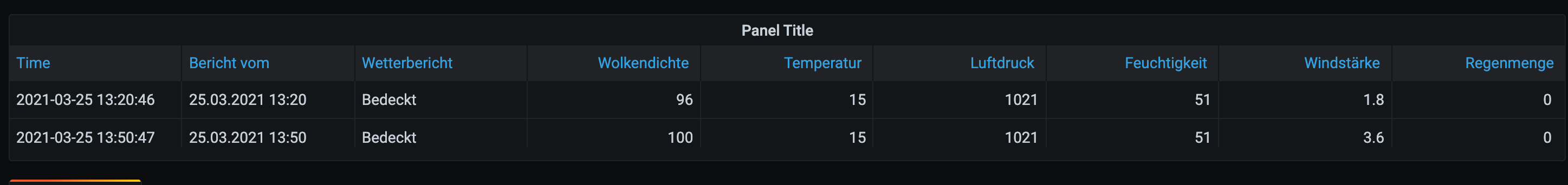 Hallo ich bin auch neu bei der solaranzeige. Probiere auch grad mich ein wenig einzuarbeiten. Aber bei den Wetterdaten scheitere ich genauso wie der Verfasser hier. Nach copy/paste des json strings kommt eine Fehlermeldung und am Ende sieht es auch so aus wie oben gezeigt. Man kann auf die einzelnen Tabellenspalten gar nicht zugreifen und die Einheiten eintragen usw. Ist diese Vorlage mit einer anderen Grafana Version erstellt worden und gar nicht kompatibel zu dem im aktuellen Image?