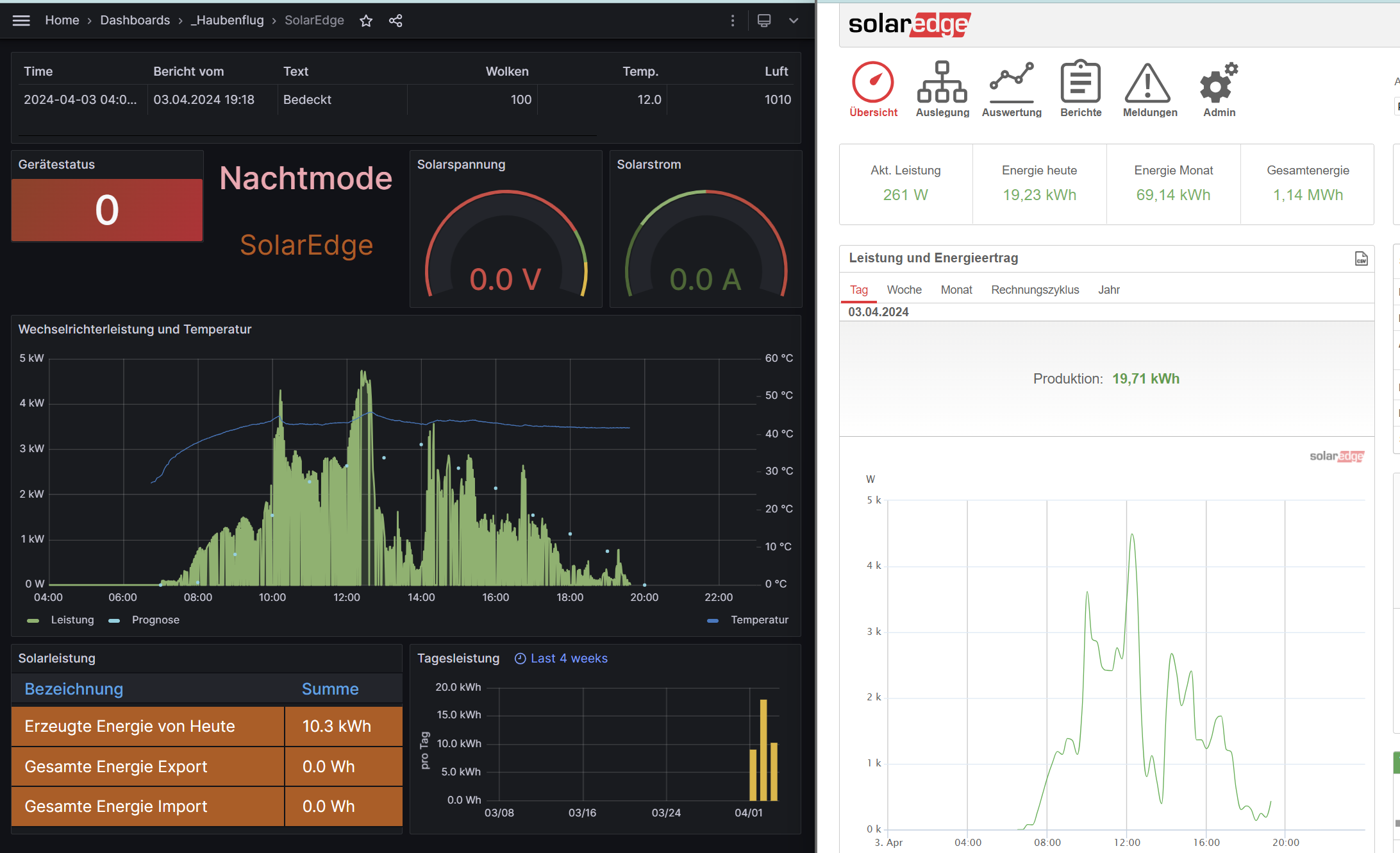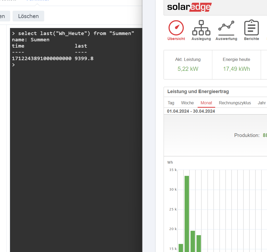 ich habe einen SolarEdge WR 12.5K OHNE Smartmeter und ohne Speicher. Die Anzeige der WechselrichterLeistung im Grafana-Dashboard über den Tag stimmt mit dem Monitoring in SolarEdge überein. Lediglich bei den Tagessummen gibt es erhebliche Abweichungen.