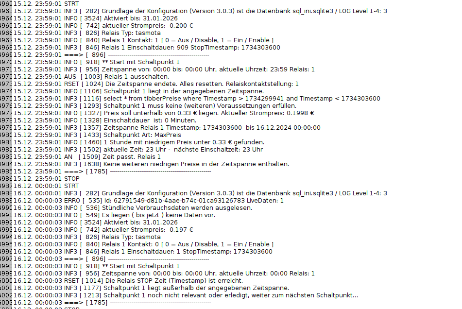 16.12. 00:00:03 INFO [ 742] aktueller Strompreis: 0.197 €