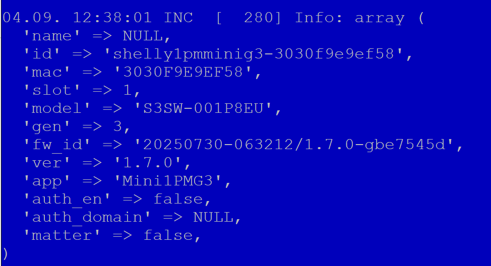 hier der Auszug aus der autov2.web.log für den Shelly 2.5. Die Daten sind aber nicht so vollständig wie für den 1PM Mini Gen3. Vielleicht liegt es daran, dass ich den Shelly 2.5 von Tasmota zurück auf Original FW zurück geflasht habe. Vielleicht hilft es ja trotzdem.