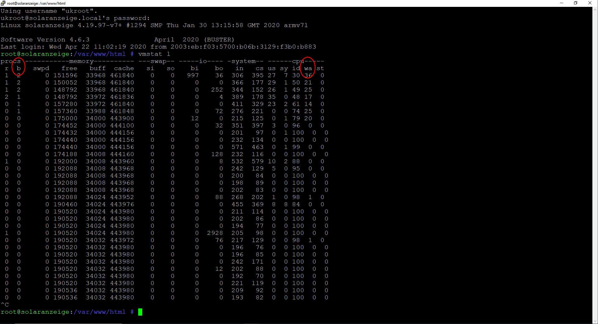 Spalte "b" besagt wieviele Threads versuchen ohne Erfolg Daten zu speichern und die Spalte "wa" besagt wie lange es dauerte bis die Daten gespeichert werden konnten. In beiden Spalten sollte im normalen Betrieb 0 stehen. Je höher der Wert umso schlechter die SD-Karte / USB-Stick.